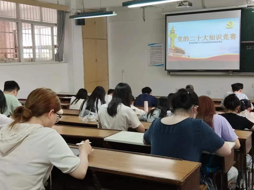 为深入落实并贯彻落实党的二十大精神,积极探索“互联网+党建”的新模式,进一步提升党员发展对象的理论知识能力水平,2023年6月6日13点30分,“党的二十大知识竞赛暨文新学院2023年春季发展对象结业考试”于威尼斯官网金盆岭校区三号教学楼成功举行。