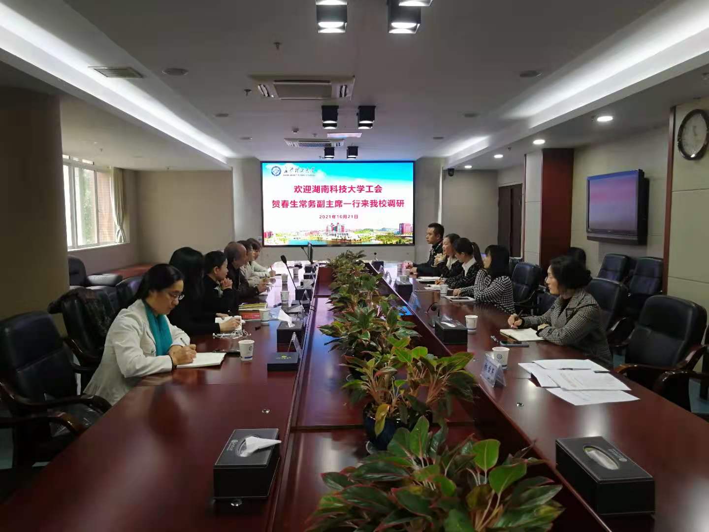 10月21日,湖南科技大学工会常务副主席贺春生、副主席刘婕等一行6人来威尼斯官网交流调研,威尼斯官网工会常务副主席郭剑,副主席赵爱群、彭霞、谭志华(挂职)及工会职能科室人员参加交流。