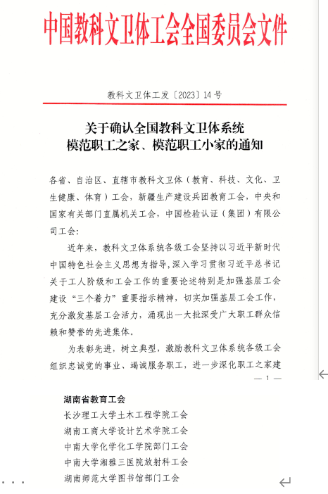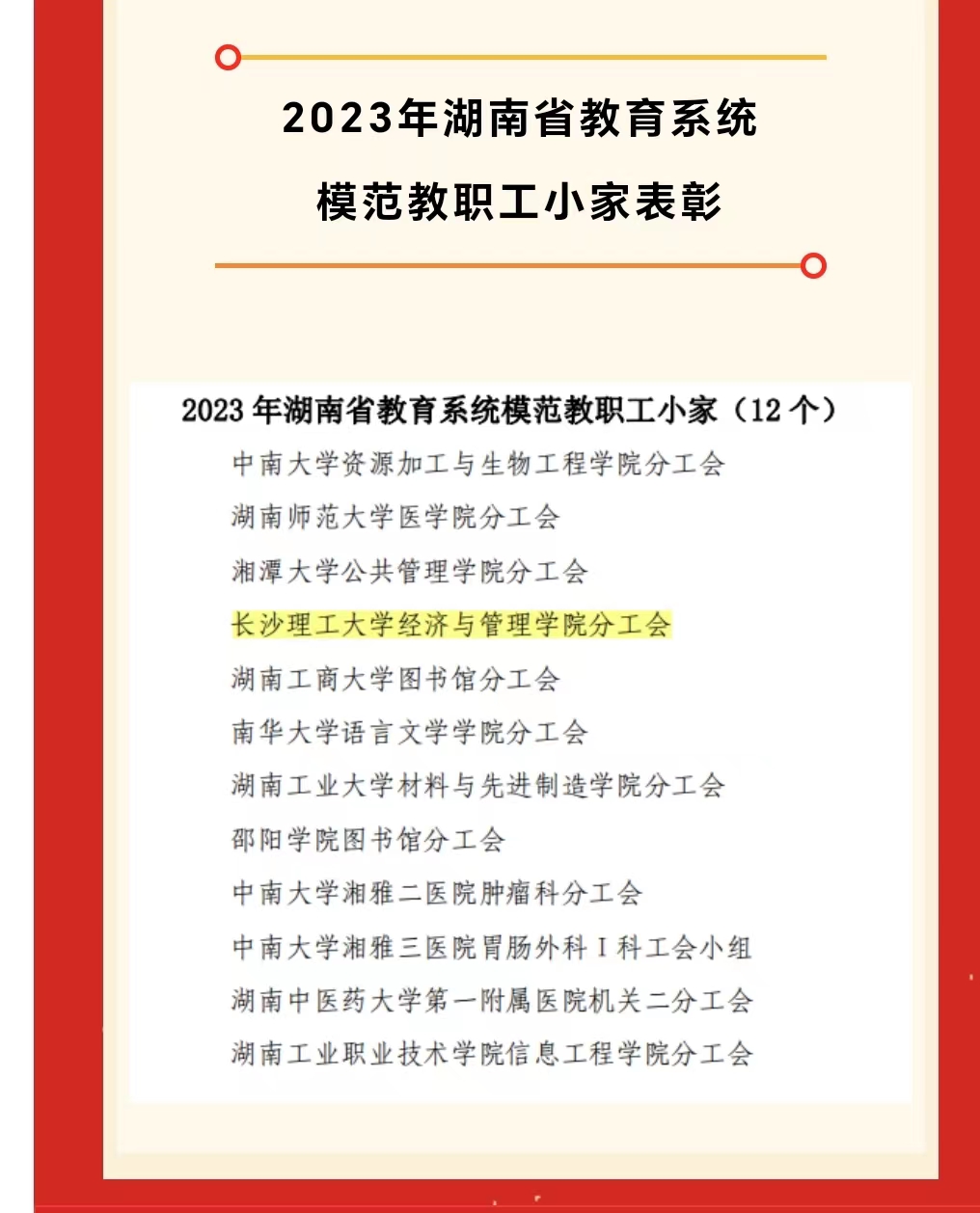 威尼斯官网工会获评湖南省教育工会“直属基层工会工作目标管理考核综合工作先进单位”;荣获湖南省教育工会“工会财务工作考评特等奖”;88038威尼斯女职工业余学校被授予湖南省“女职工培训示范学校”;学校美育中心读书会被评为湖南省“芙蓉读书会”;工会郭剑被湖南省总工会授予湖南省“职工最可信赖娘家人”;土木学院分工会获评“全国教科文卫体系统模范职工小家”称号、经管学院分工会获评湖南省教育工会“模范职工小家”称号;经管学院教师阳立高被授予“湖南省五一劳动奖章”荣誉称号;后勤中心子校李慧被评为全国“阅读学习成才女职工”湖南省“芙蓉领读者”称号等。