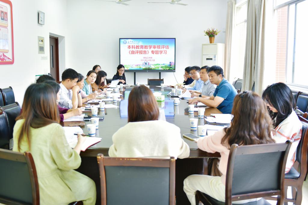 10月25日上午,学工部在学生活动中心401召开本科教育教学审核评估《自评报告》专题学习会,系统学习了学校新修订的自评工作开展情况等。会议由学工部部长邱国良主持,学工部全体成员参加。