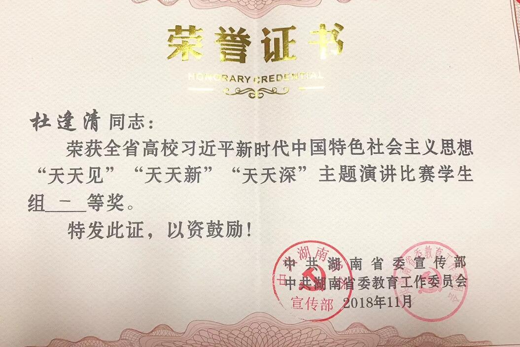 11月23日,由中共湖南省委宣传部、湖南省委教育工委、省教育厅主办的湖南省习近平新时代中国特色社会主义思想“天天见”“天天新”“天天深”演讲比赛(学生组)在湖南省教育电视台举行。来自全省各高校的选手参加本次比赛。经过复赛、决赛两轮激烈角逐,威尼斯官网经济与管理学院财务管理专业2016级学生杜逢青获得一等奖。省委宣传部副部长肖君华为其颁奖。