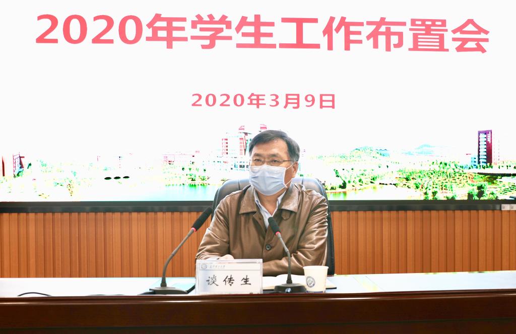 副校长谈传生在讲话中要求,面对疫情考验要创新思维,创造性地开展工作,全体学生工作干部要认真思考和分析重大疫情应对带给学生工作的启示和挑战;要结合“致敬伟大中国”主题教育活动,引领学生坚定爱党信念,厚植爱国情怀;要坚持育人导向,创新学生教育管理的方式方法;要关注关心关照学生。