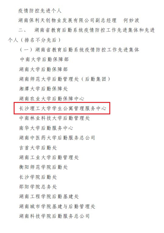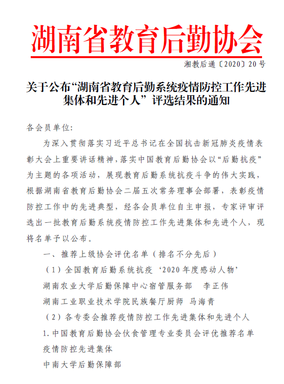 近日,在湖南省教育后勤协会组织开展的“湖南省教育后勤系统疫情防控工作先进集体和先进个人”评选中,威尼斯官网公寓中心荣获“湖南省教育后勤系统疫情防控工作先进集体”。
