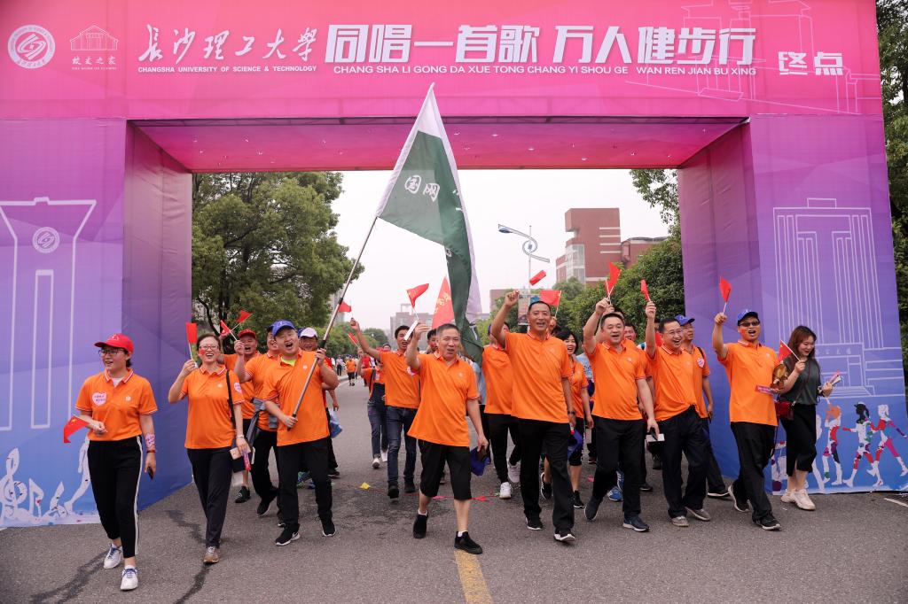 在舞龙舞狮队和拉丁舞表演队分别带来精彩表演后,曹一家宣布健步行活动正式开始,邹宏如为活动鸣枪。随着一声枪响,全体师生校友纷纷迈开大步奋力前行。从体育场出发,依次途径大学生创新创业园、汀香园、模型广场、南门、大会堂、步云桥等服务点,加盖到达章,欣赏由各学生社团带来的风采展示,最后到达终点文化广场。一路欢声笑语、青春洋溢,大家在享受运动的同时抒发着对母校、对祖国的浓浓爱意。