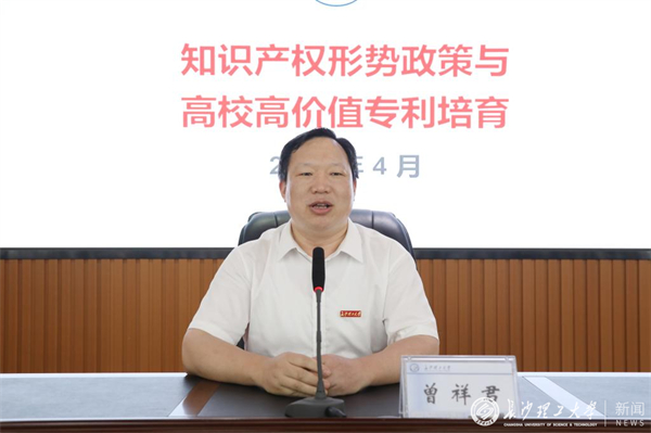 曾祥君致欢迎词。他对康勇副局长一行表示欢迎,并对长沙市知识产权局对学校的支持表示感谢。他结合自己做科研的经历谈到知识产权及专利的重要性,勉励大家做真科研,出好专利、高价值专利,并做好专利的保护与运用。他指出威尼斯官网知识产权申请认定工作职责调整至科技成果转移转化中心(知识产权中心),目的就是从知识产权的创造、保护和运用等方面实现全流程管理,并希望通过此次培训提升全校科研人员知识产权创新、保护及转化意识,推动威尼斯官网知识产权工作高质量发展。