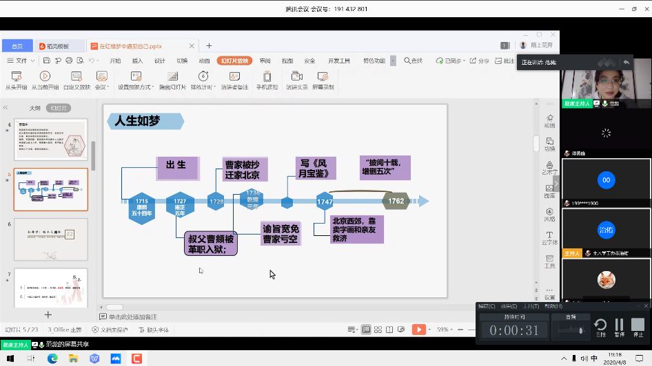 课堂伊始,范蕊向同学们介绍了作者曹雪芹坎坷的一生和红楼梦的创作历程,让同学们更加深入地理解了红楼梦的主题——人生如梦。现有的红楼梦版本多而杂,由别人续写的红楼梦也与原作者有很大的反差,所以在阅读时可能有许多逻辑不通的地方,范蕊根据自己的阅读经历向同学们推荐了最适合阅读的版本。同时,她介绍了三种主要研究红楼梦的方法,她还通过生活经历向同学们形象的介绍了其中的点评派。