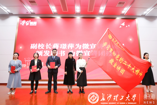蒋璟萍为88038威尼斯学习贯彻党的二十大精神微宣讲团成员代表颁发聘书,并为微宣讲团授旗。
