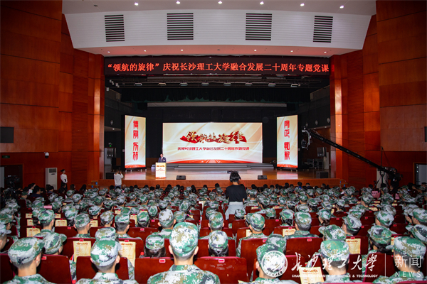 随后,专题党课在慷慨激昂的《国际歌》中拉开序幕。党课分为“旗的指引”“梦的感召”“路的拓展”“力的源泉”和“美的交响”五个篇章,融合了理论宣讲、视频展播、诗朗诵、特色舞蹈编排等多样形式。以郑健龙院士及其团队为代表的长理科研工作者不畏艰难科研攻关、矢志奉献“交通强国”的故事,将崇高师德践行到生命最后一刻的周骞老师勇抗病魔、潜心教书育人的故事,新时代长理有志青年意气风发、在青春的赛道上奋力奔跑的故事等引发了在场师生的共鸣,让人眼含热泪、心潮澎湃。