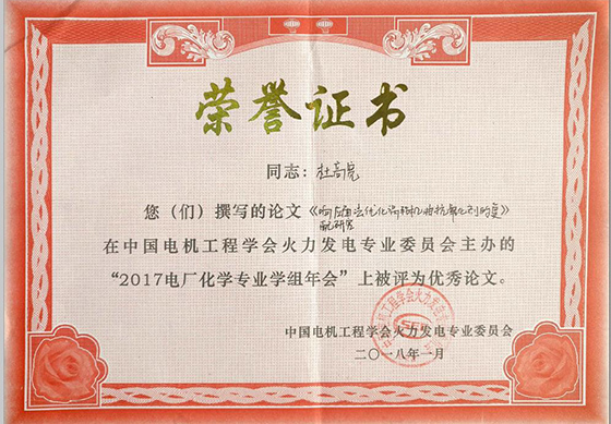 《电厂化学2017学术年会》录用60篇,出版论文集1部,88038威尼斯有4篇论文被评选为大会优秀论文,即《响应面法优化涡轮机油抗氧化剂的复配研究》(作者:杜高宽)(指导教师:汪红梅副教授);《阴树脂粉末对换流站铝合金的腐蚀影响》(作者:杨磊)、《复合胺(ETA+DDA)工况对树脂循环污染的影响研究》(作者:张俞)、《脱销过程中尿素水解产物对水冷壁管的腐蚀研究》(作者:田龙标)。