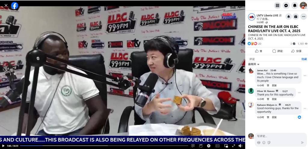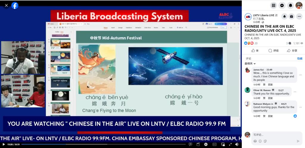 当地时间2025年10月4日上午,利比里亚大学孔子学院在利比里亚国家广播电台推出《空中汉语》栏目2025—2026学年新一季节目的首播。值此中国中秋节来临之际,本期节目特别以“中秋节”为主题,通过利比里亚国家广播电台(ELBC FM99.9)播出,同时在利比里亚国家电视台(LNTV Liberia LIVE)脸书平台同步直播。