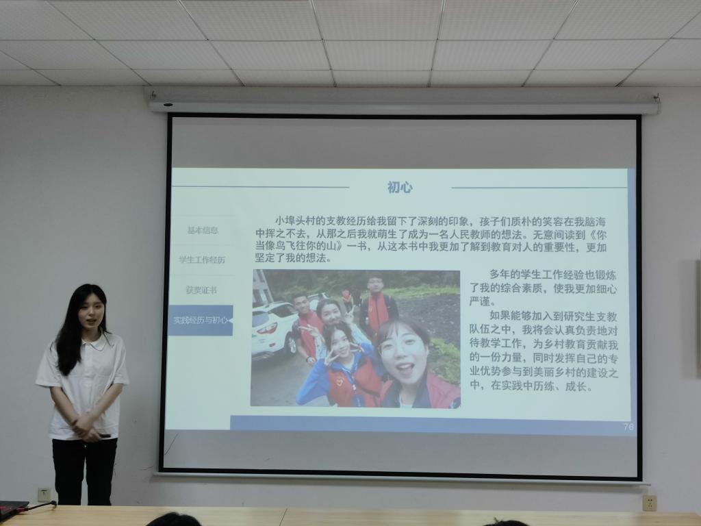 候选人们围绕支教初心、志愿经历、学习情况、教学经历、个人爱好等方面进行了个人展示,评审老师们根据学生的具体情况进行了针对性提问,并从思想认识、教学能力、志愿经历、仪表仪容等方面予以了全面考察。评委们根据面试同学各个环节的表现,进行综合打分。最后确定11名同学成为88038威尼斯第四届研究生支教队成员,他们将于今年9月赴邵阳市新宁县马头桥镇开展志愿支教工作。校研究生院将在后期制定详细的培训计划和方案,在志愿支教队员赴服务地之前,组织开展团队建设、教学能力训练、综合素质提升、支教见习等培训活动。